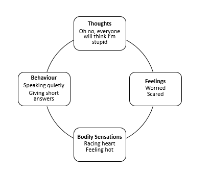 CBT helps young people to make sense of problems by breaking them down into smaller parts to see the connections between them. CBT looks at how we think about a situation and how this affects the way we behave. In turn our actions can affect how we think and feel creating a vicious cycle that works to maintain our psychological distress.